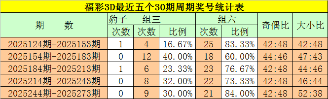 在最近一个30期周期内(第2025244期-第2025273期),豹子奖号莫得出现,组三奖号开出了9次,所占比例为36%,组六奖号共出现21期,开出比例为84%,组六号码不竭出现2期,发扬十分活跃,本期预测奖号为组六号码。