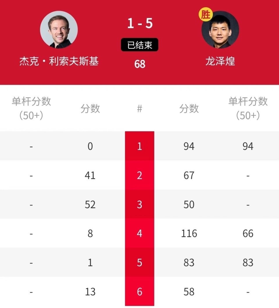 与利索夫斯基的这场比赛,龙泽煌在家乡武汉球迷的妥当下,一上来就展示出超越霸气的迫切态势。比赛第一局,龙泽煌径直打出单杆94分,94-0零封“小司机”,1-0强势开局。