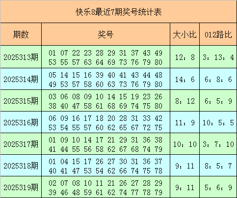 欢喜8第2025319期奖号为:02 07 08 10 11 21 26 27 28 29 39 46 48 59 61 62 74 77 78 79,其中奖号012路比为5:6:9,大小比为9:11。